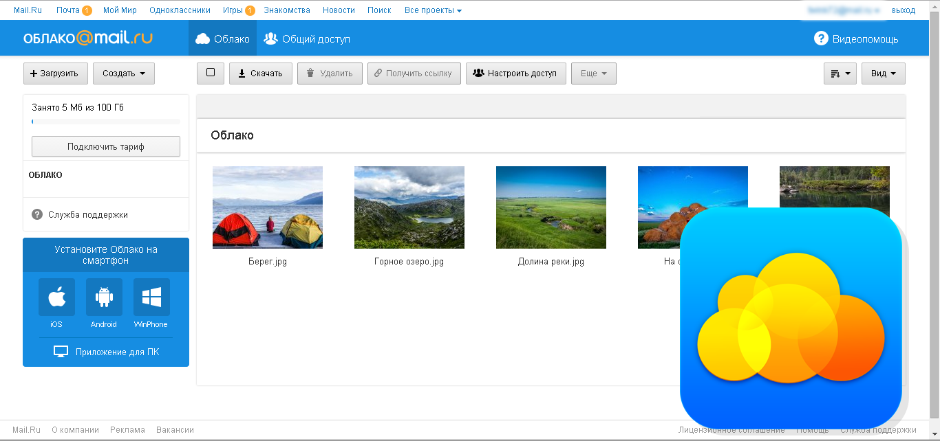 Облако@mail.ru предоставляет новым пользователям рекордные 100 Гб свободного места, которые за отдельную плату можно расширить до 1 Тб. Облако имеет клиенты для всех ОС и мобильных платформ, а также предоставляет возможность синхронизировать фотоаппарат с хранилищем для быстрого скачивания фотографий.